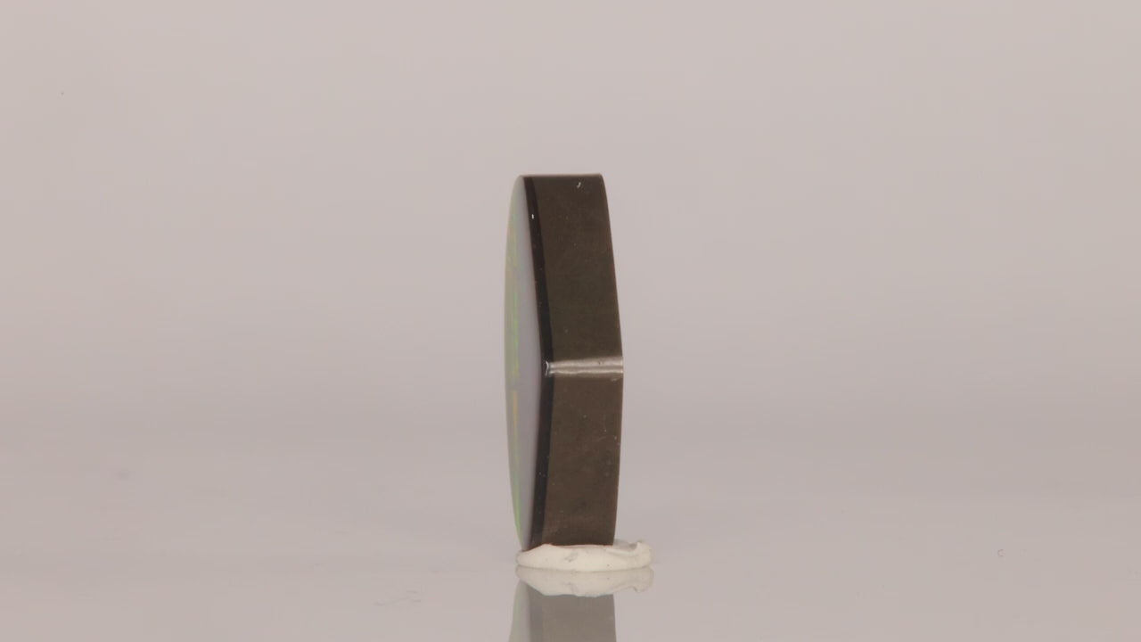 One 7.21 carats Wide pear ammolite from Lethbridge, Alberta, Canada, Yellow Orange & Green color, measuring 11 mm wide, 15.6 mm long, 3.2 mm deep. Enhanced by Filling