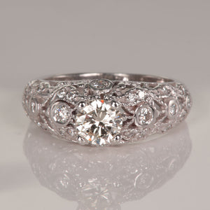 Ladies' estate diamond ring, with one L color, SI1 clarity, round brilliant cut diamond. The diamond weighs .80 carat, measures 6 mm wide by 6 mm long, and is 4 prong set. In addition, there are twenty-four prong and bezel round brilliant cut diamonds, G- color, VS2-SI1 clarity, with a total weight of .35 carat. The ring weighs 5.68 grams.