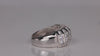 Estate Piece (Previously Owned and Refurbished) One 10k white gold cubic zirconia ring. The cubic zirconias are round cut and have an approximate size of 2mm and 2.5mm. The ring weighs 4.13 grams. Current ring size is 5.  Ring can be sized up/down two sizes from current.