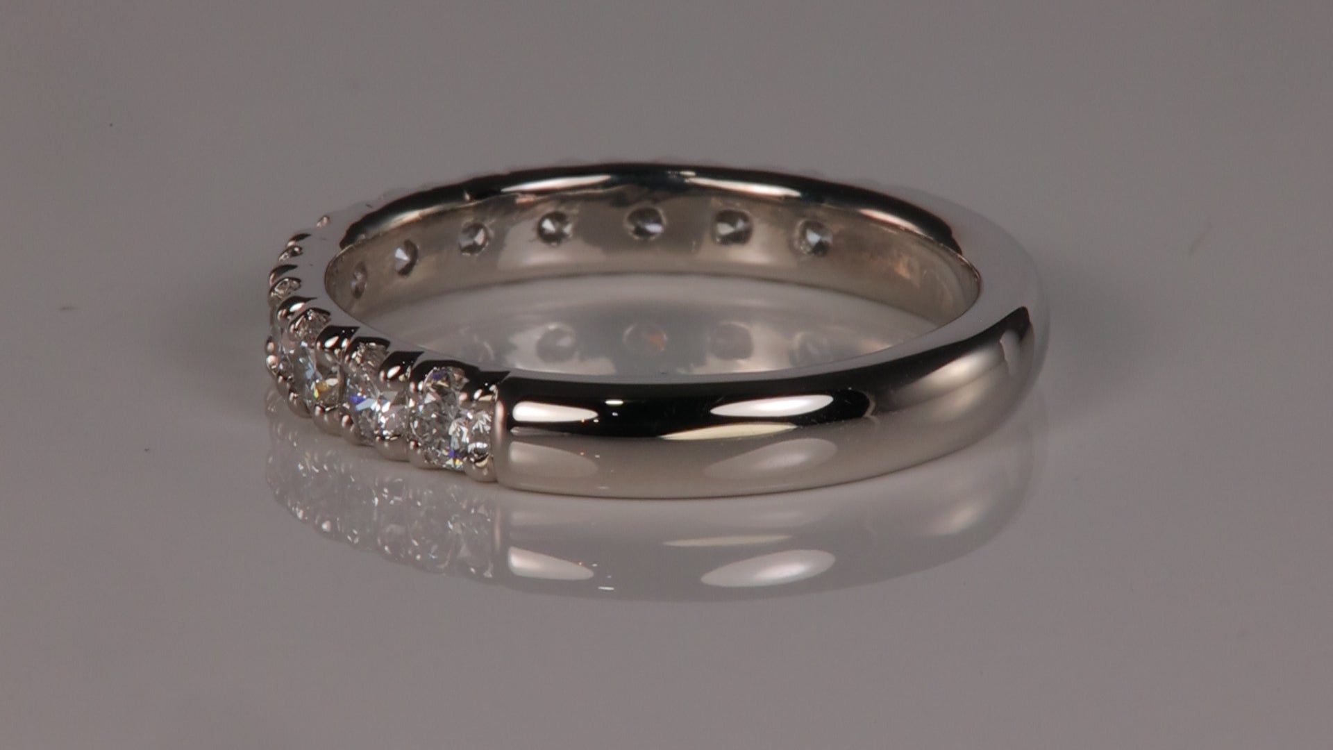 Platinum diamond ring by Christopher Michael, with twelve F-G color, VS2-SI1 clarity, natural round brilliant cut diamonds. The diamonds have a total weight of .63 carat, measure 2.4 mm wide by 2.4 mm long, and are 4 prong set. The ring weighs 3.9 grams.