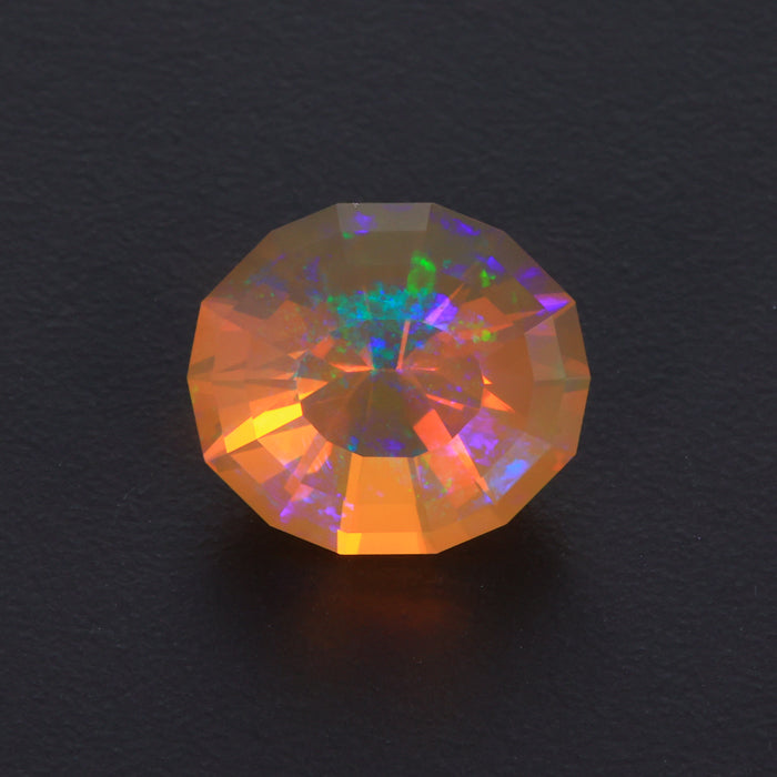 One 13.50 carats faceted shield semi black opal from Welo Ethiopia, cut grade very good, vivid brightness, measuring 23.2 mm wide, 14.6 mm long, 7.3 mm deep; with very good polish and very good symmetry.  Cut by Steve Moriarty.