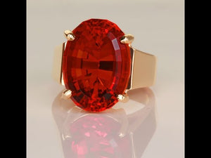 Estate Ring (Previously Owned and Refurbished) Ladies' 14k yellow gold citrine quartz ring, with one reddish orange color, GIA Type II Clarity VS1, oval citrine quartz from Uraguay.. The citrine quartz was cut by Larry Moriarty weighs approximately 8.54 carats, measures 12 mm wide by 16.3 mm long by 9.3 mm deep, has excellent cut, excellent polish and excellent symmetry, and is 4 prong set. The ring weighs 11 grams. Citrine is heated to enhance color.