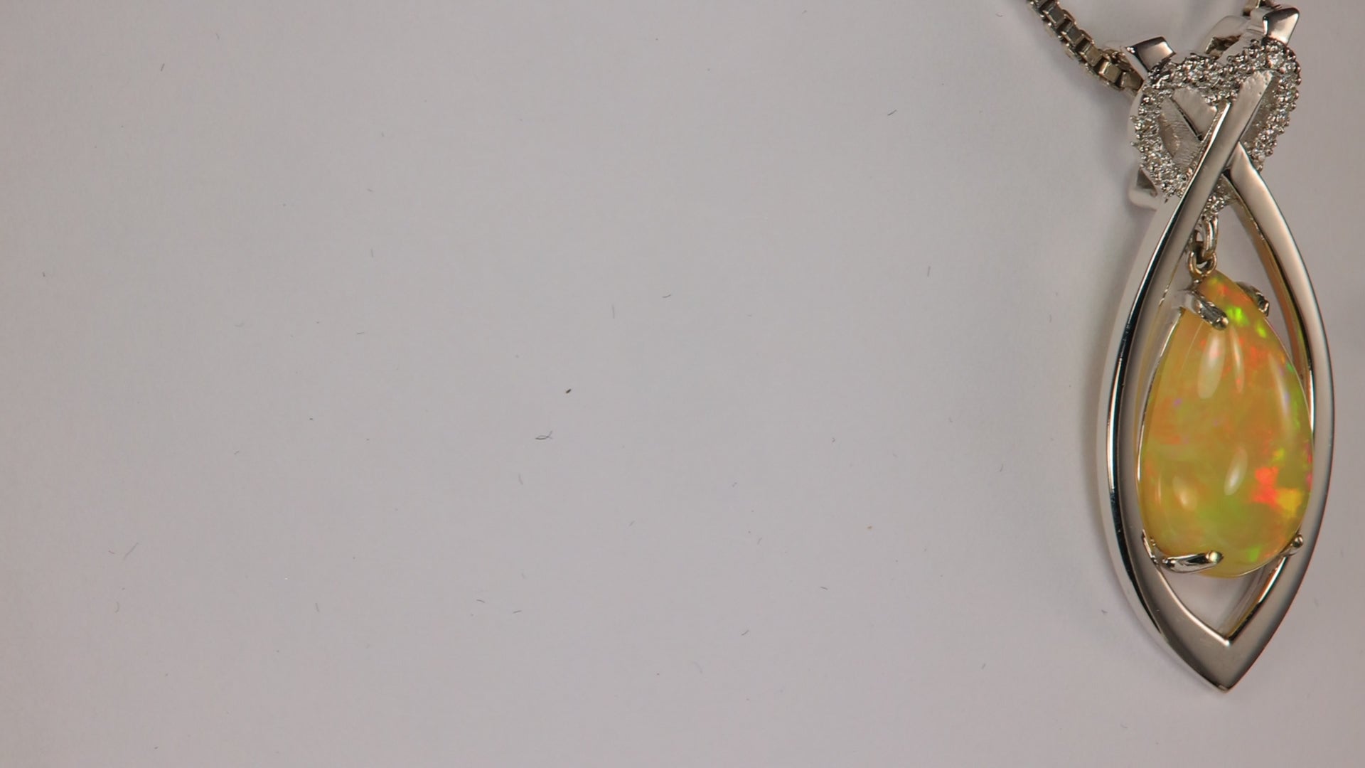Estate Piece (Previously Owned and Refurbished) Preowned 14k white gold Ethiopian Welo opal pendant designed by Christopher Michael, measuring 40 mm long and 11 mm wide, with one white with rainbow play of color color, pear shape cabochon Ethiopian Welo opal. The Ethiopian Welo opal weighs 4.97 carats, measures 10.8 mm wide by 18.2 mm long by 6.1 mm deep, and is 4 prong set in 14k white gold. In addition, the heart has nineteen pave' set ideal round brilliant cut diamonds, F-G color, SI2 clarity, measuring 1.2 mm wide by 1.2 mm long with a total weight of .13 carat. The pendant weighs 6.3 grams. Sold originally for $1600.