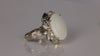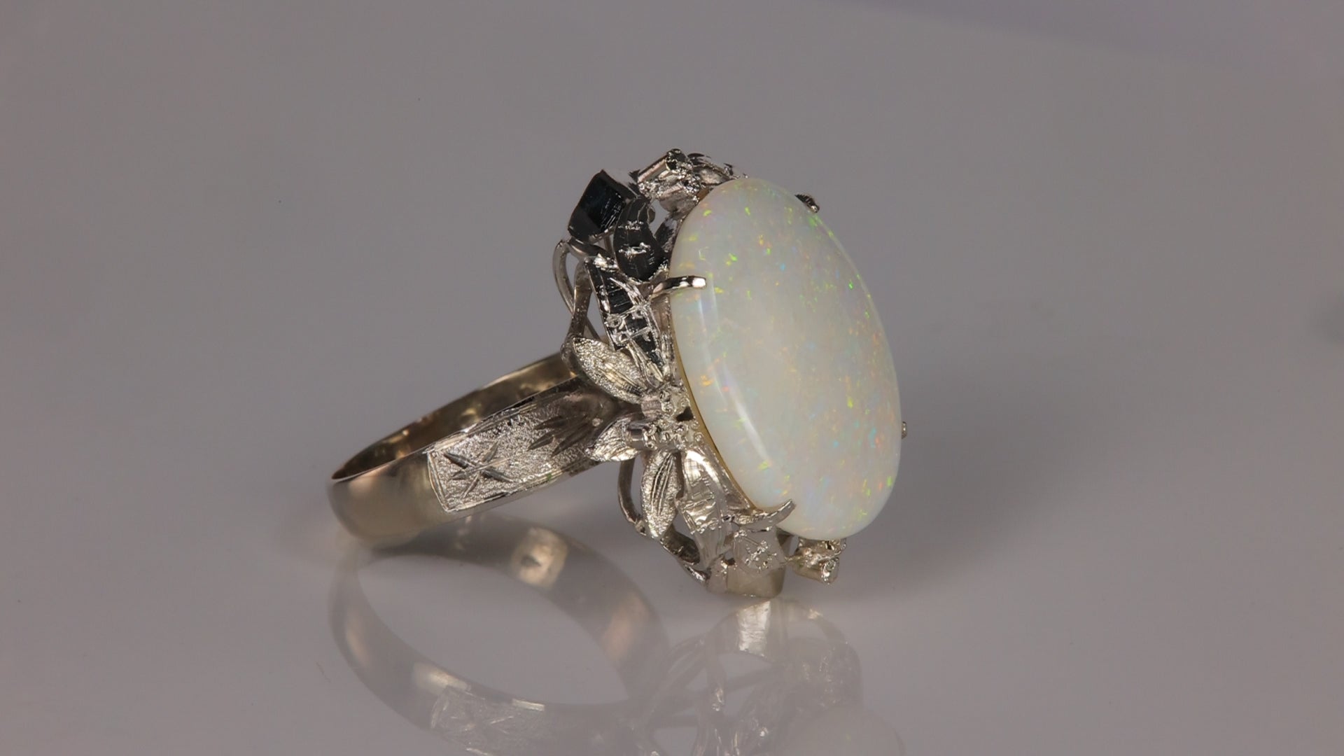 Estate Piece (Previously Owned and Refurbished) One 18k white gold opal statement ring. The opal is oval cabochon cut and is multi-color. It has a total approximate weight of 6.00cts. The ring weighs 8.1 grams. Current ring size is 7 1/4. Ring can be sized up/down two sizes from current. *Crazing to stone to note.