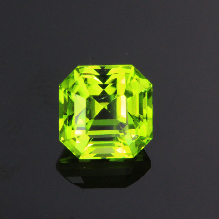 One 3.16 carats asscher cut peridot from Pakistan, green color, VS clarity, cut grade excellent, measuring 7.7 mm wide, 7.7 mm long, 6.7 mm deep; with excellent polish and excellent symmetry. The proportions of the peridot are as follows: total depth 87%, table width 45.5%. The overall quality rating of this peridot is 921 out of 1000. Peridot was cut by Steve Moriarty.
