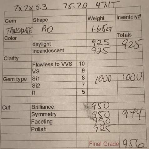 One 1.65 carats round brilliant cut tanzanite, blue violet exceptional color, FLAWLESS TO VVS clarity, cut grade excellent, measuring 7 mm wide, 7 mm long, 5.3 mm deep; with excellent polish and excellent symmetry. The proportions of the tanzanite are as follows: total depth 75.7%, table width 47.1%. The overall quality rating of this tanzanite is 956 out of 1000.