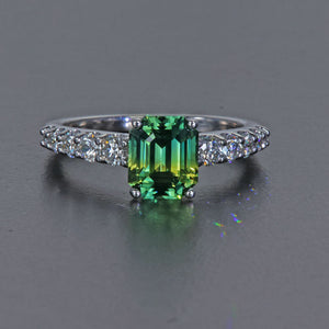14k white gold sapphire ring, with bi-color, green yellow color, GIA Type II Clarity Vs1 (GIA TYPE II), emerald cut sapphire from Sri Lanka. The sapphire weighs of 2.56 carats, measure 6.6 mm wide by 7.9 mm long by 5.1 mm deep, has very good cut, very good polish and very good symmetry, and are 4 prong set. In addition, there are ten prong set round brilliant cut diamonds, G-H color, S11-SI2 clarity, with a total weight of .63 carat. The ring weighs 4.53 grams. Sapphire is heated to enhance color.
