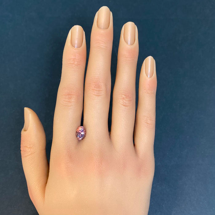 One 3.39 carats oval imperial zircon from Singida, Tanzania, Brownish Peachy Pink color, VS2 clarity, cut grade excellent, measuring 6.7 mm wide, 9.7 mm long, 5.5 mm deep; with excellent polish and excellent symmetry. Cut by Marsha Tokarski.