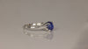 Estate Piece (Previously Owned and Refurbished) One 10k white gold synthetic star sapphire and diamond accent ring. The synthetic star sapphire is oval cabochon cut, blue in color and has a total approximate size of 6.7mm x 5mm. There are diamond accents on either side of the setting. The ring weighs 1.81 grams. Current ring size is 6 1/2. Ring can be sized up/down two sizes from current.