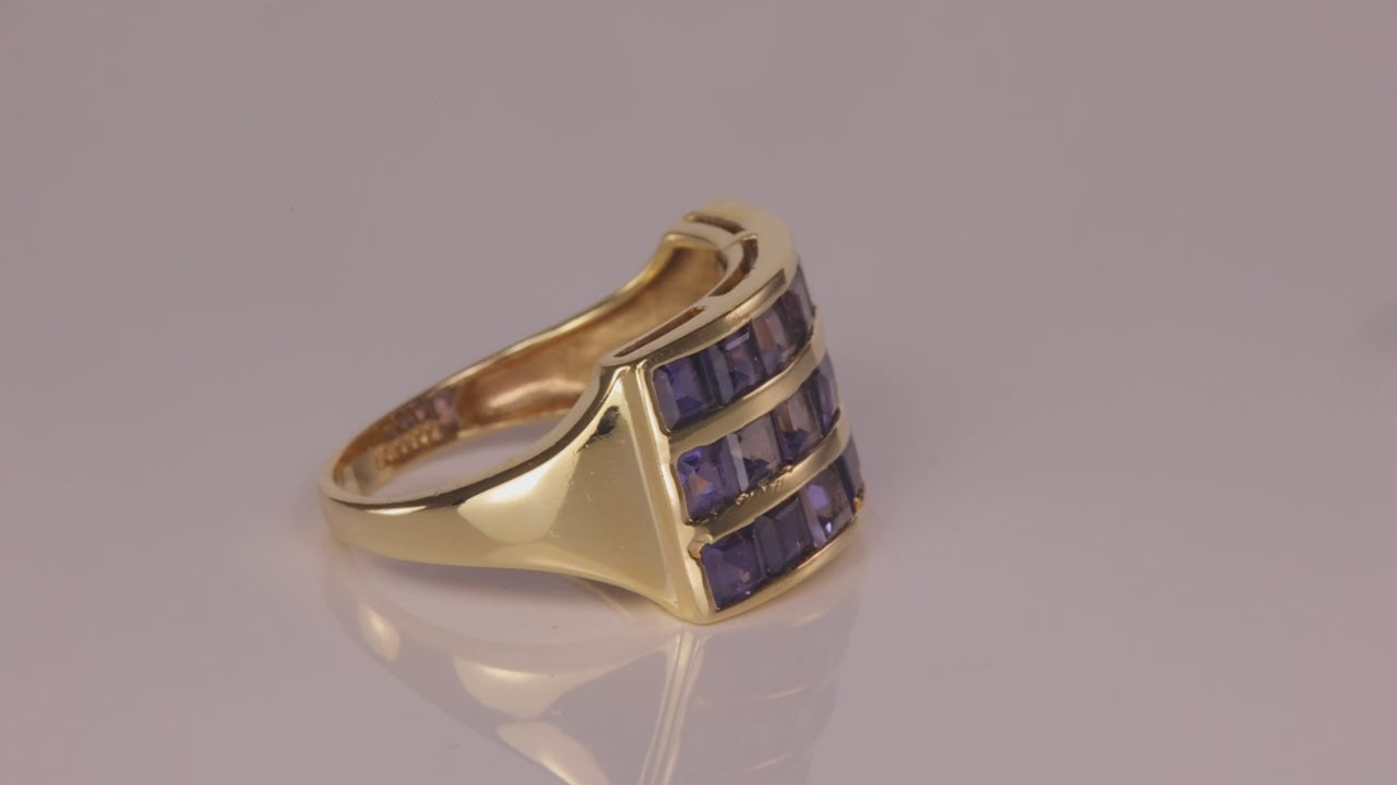 Estate Piece (Previously Owned and Refurbished) One 10k yellow gold likely iolite ring. The gems are princess cut, grayish violet in color and have an approximate size of 2.7mm by 2.7mm. The ring weighs 3.94 grams. Current ring size is 7 1/2. Ring can be sized up/down two sizes from current.