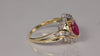 Estate Piece (Previously Owned and Refurbished) One 10k yellow gold synthetic ruby and diamond accent ring. The synthetic ruby is marquise cut, red color and has a total approximate weight of .75cts. There are diamond accents. The ring weighs 3 grams. Current ring size is 9 1/4. Ring can be sized up/down two sizes from current.