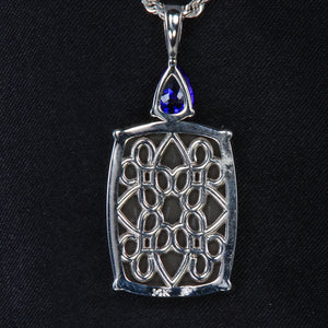 14k white gold ammonite pendant designed by Johny Vinay, with one cushion cabochon ammonite. The ammonite weighs 19.68 carats, measures 16.3 mm wide by 22.2 mm long by 3.7 mm deep, and is 4 prong set. In addition, there is one 3 prong set pear-shape brilliant cut tanzanite, VIOLET BLUE VIVID color, VS1 clarity, measuring 5 mm wide by 7 mm long with a weight of .70 carat. The pendant weighs 9.14 grams. Ammolite is a fossilized ammonite that lived 70 million years ago.