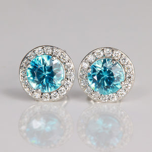 14K White Gold Blue Zircon Diamond Halo Stud Earrings 1.31cts