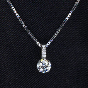 14k white gold diamond pendant, with one H color, SI2 clarity, round brilliant cut diamond. The diamond weighs .41 carat, measures 4.75 mm wide by 4.8 mm long by 3 mm deep, and is 4 prong set. In addition, there are four prong set round brilliant cut diamonds, G-H color, SI2 clarity, with a total weight of .02 carat.