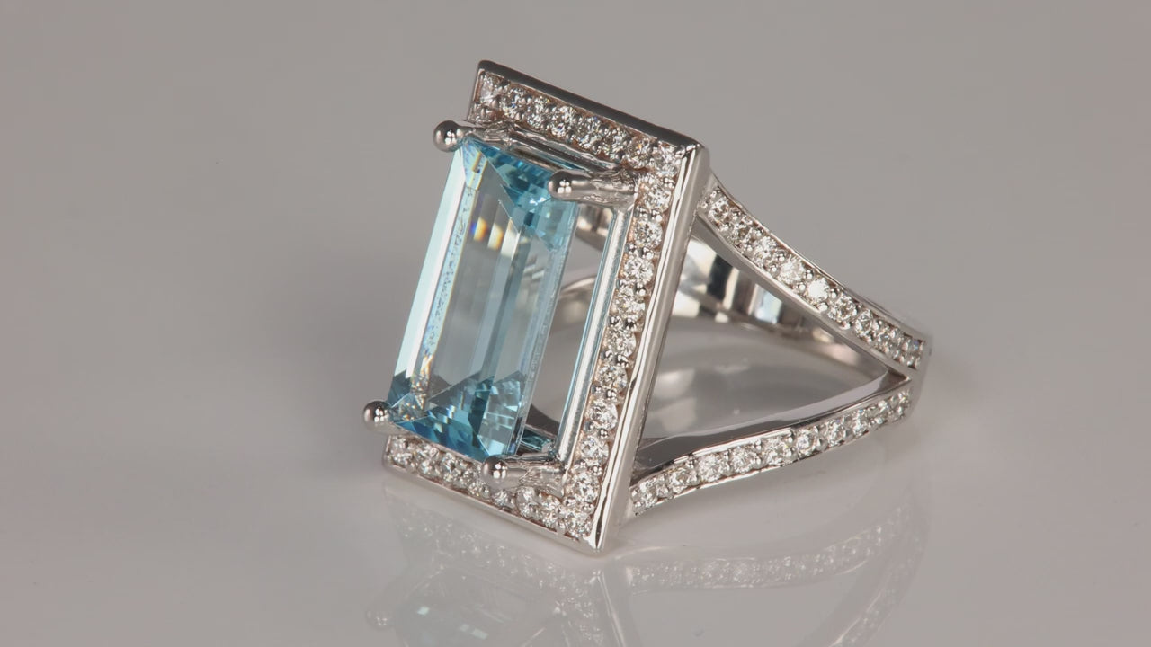 14k white gold aquamarine ring, with one blue color, GIA Type I Clarity VS1, emerald cut aquamarine. The aquamarine weighs 4.71 carats, measures 7.9 mm wide by 14 mm long by 6 mm deep, and is 4 prong set. In addition, there are seventy-four prong set round brilliant cut diamonds, F-G color, VS2-SI1 clarity, with a total weight of .94 carat. The ring weighs 10.69 grams. Aquamarine is heated to enhance color.