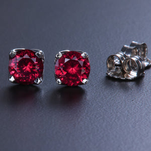 Pair of ladies' 14k white gold umbalite garnet stud pierced earrings with large heavyweight friction backs, with two violet red color, VS clarity, round brilliant cut umbalite garnets from Tanzania. The umbalite garnets have a total weight of 2.46 carats, measure 6.5 mm wide by 6.5 mm long, and are 4 prong set. Natural untreated color.