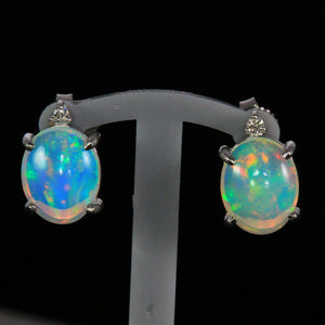 Pair of ladies' 14k white gold opal stud pierced earrings with friction backs, with two oval cabochon opals from Welo Ethiopia. The opals have a total weight of 2.51 carats, measure 8 mm wide by 10 mm long, and are 4 prong set. In addition, there are two prong set round brilliant cut diamonds, F-G color, VS clarity, measuring 1.7 mm wide by 1.7 mm long with a total weight of .04 carat.