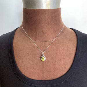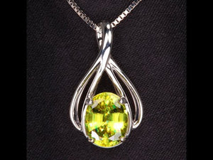 One 14 karat white gold pendant set with a 2.77 carats oval sphene from Madagascar, yellowish green color, VS1 clarity, cut grade very good, measuring 7.5 mm wide, 9.7 mm long, 4.9 mm deep; with very good polish and very good symmetry. This gem display very strong dichroism. Sphene has natural untreated color. Pendant weighs 3.33 grams.