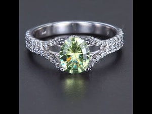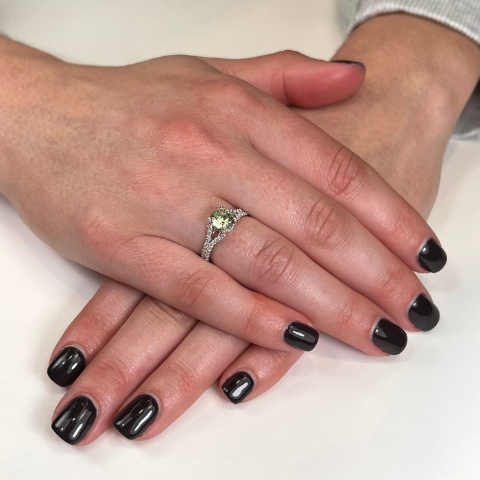 14k white gold chrysoberyl ring, with one light yellowish green color, VVS clarity, oval chrysoberyl from Sri Lanka. The chrysoberyl weighs 1.39 carats, measures 6.1 mm wide by 7.3 mm long, and is 4 prong set. In addition, there are prong set round brilliant cut diamonds, G-H color, SI2 clarity, with a total weight of .50 carat. The ring weighs 3.49 grams..