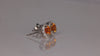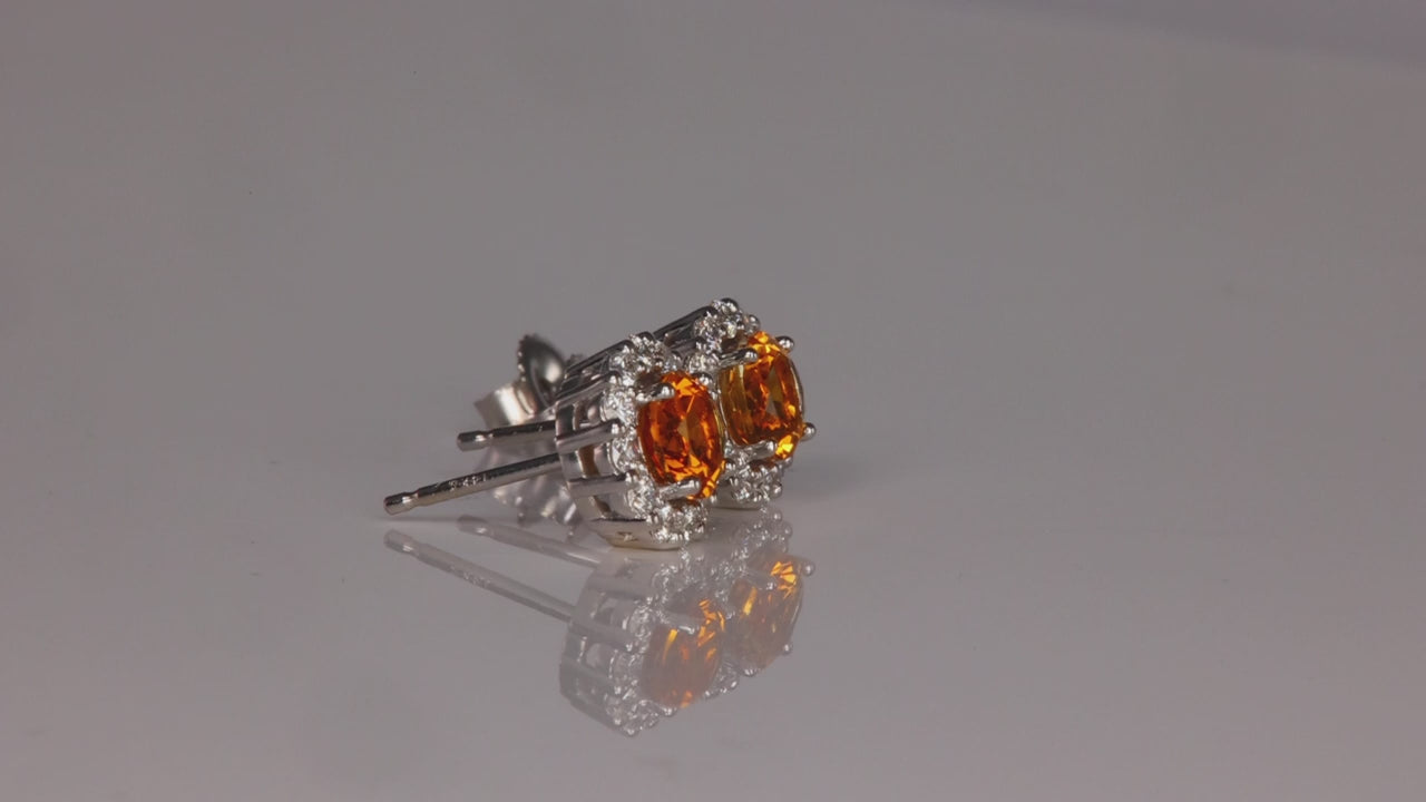 14k white gold sapphire stud pierced earrings with friction backs, with two orange color, GIA Type II Clarity VS1-VS2, round brilliant cut sapphires from Montana. The sapphires have a total weight of 1.26 carats, measure 5 mm wide by 5 mm long, and are 4 prong set. In addition, there are twenty-four prong set round brilliant cut diamonds, F-G color, VS2-SI1 clarity, measuring 1.6 mm wide by 1.6 mm long with a total weight of .40 carat. Sapphire are color enhanced by heating.