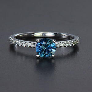 14k white gold sapphire ring, with one greenish blue color,  Clarity VS1, round brilliant cut sapphire from Rock Creek in Montana. The sapphire weighs .87 carat, measures 5.8 mm wide by 5.8 mm long by 3.7 mm deep, has very good cut, very good polish and very good symmetry, and is 4 prong set. In addition, there are thirty prong set round brilliant cut diamonds, G-H color, SI clarity, with a total weight of .33 carat. The ring weighs 1.87 grams. Sapphire is enhanced by heating.