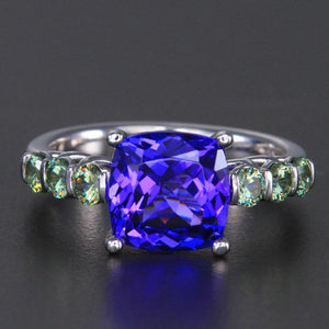Ladies' 14k white gold tanzanite ring, with one blue violet exceptional (25%/75%) color, GIA Type I Clarity FLAWLESS VVS, square cushion tanzanite. The tanzanite weighs 3.89 carats, measures 9 mm wide by 9 mm long, has very good cut, good polish and good symmetry, and is 4 prong set. In addition, there are six prong set round brilliant cut demantoid garnets from Madagascar, LT. GREEN color, VS clarity, measuring 3 mm wide by 3 mm long with a total weight of .77 carat. The ring weighs 5.22 grams.  Tanzanite is color enhanced by heating