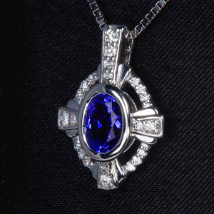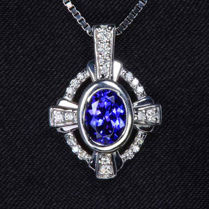 Ladies' 14k white gold tanzanite pendant, with one blue violet vivid (30%/70%) more violet color, GIA Type I Clarity VS1, oval tanzanite. The tanzanite weighs .80 carat, measures 4.5 mm wide by 6.5 mm long, and is bezel set. In addition, there are eight prong set round brilliant cut diamonds, F-G color, VS2-SI1 clarity, with a total weight of .13 carat. The pendant weighs 2.64 grams. Tanzanite is color enhanced by heating.