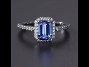 One 14kt white gold ring set with a uniquely colored 1.80 carats emerald cut tanzanite, violet blue moderate (30%/70%) color, VS1 clarity, cut grade excellent, measuring 5.8 mm wide, 7.7 mm long, 4.5 mm deep; with very good polish and very good symmetry. The proportions of the tanzanite are as follows: total depth 77.5%, table width 58.6%. Tanzanite is color enhanced by heating. Accenting the tanzanite are round brilliant cut diamonds having G-H color and Si2 clarity with a total weight of .25 carats. The ring weighs 2.65 grams.