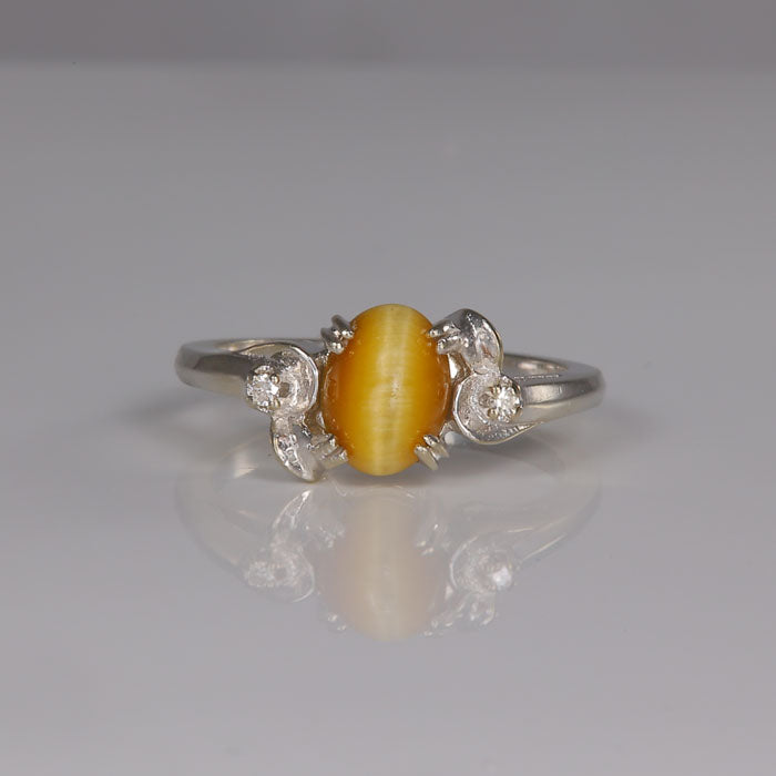 Estate Piece (Previously Owned and Refurbished) One 14k white gold tiger's eye and diamond ring. The tiger's eye is golden brown in color and an oval cabochon cut with a total approximate size of 8.1mm x 5.8mm. There are diamond accents in the setting. The ring weighs 3.9 grams. Current ring size is 6 1/2. Ring can be sized up/down two sizes from current.