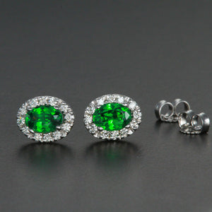 Pair of  14k white gold halo tsavorite garnet stud pierced earrings with friction backs, with two fine green color, GIA Type Il Clarity VS, oval tsavorite garnets. The tsavorite garnets have a total weight of 1.06 carats, measure 4 mm wide by 5.8 mm long, and are 4 prong set. Accenting the tsavorites are 24 round brilliant diamonds with F-G color and VS2-Si1 clarity and a total weight of .22 carats.