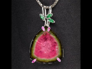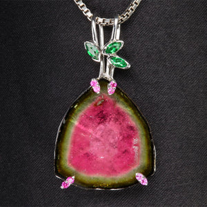 14K White Gold Watermelon Tourmaline, Tsavorites and Sapphire Pendant 21.13 Carats