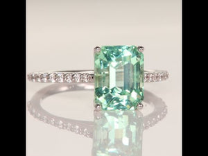 Ladies' 14k white gold tourmaline ring, with one slightly bluish green color, Vs1 clarity, emerald cut tourmaline. The tourmaline weighs 3.25 carats, measures 7.2 mm wide by 9.2 mm long by 6.5 mm deep, has excellent cut, excellent polish and excellent symmetry, and is 4 prong set in 14k white gold. In addition, there are twenty prong set round brilliant cut diamonds, F-G color, VS2-SI1 clarity, measuring 1.3 mm wide by 1.3 mm long with a total weight of .16 carat. The ring weighs 2.6 grams.