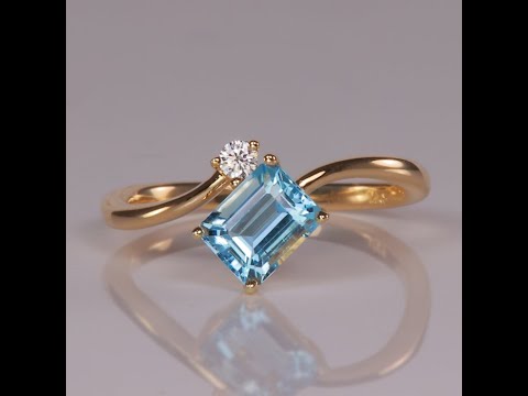 14k yellow gold aquamarine ring, with one blue color, GIA Type I Clarity VS1, emerald cut aquamarine from Madagascar. The aquamarine weighs 1.11 carats, measures 6.7 mm wide by 5.3 mm long, and is 4 prong set. In addition, there is one prong set round brilliant cut diamond, F-G color, VS2-SI1 clarity, measuring 2.4 mm wide by 2.4 mm long with a weight of .05 carat. The ring weighs 2.6 grams.