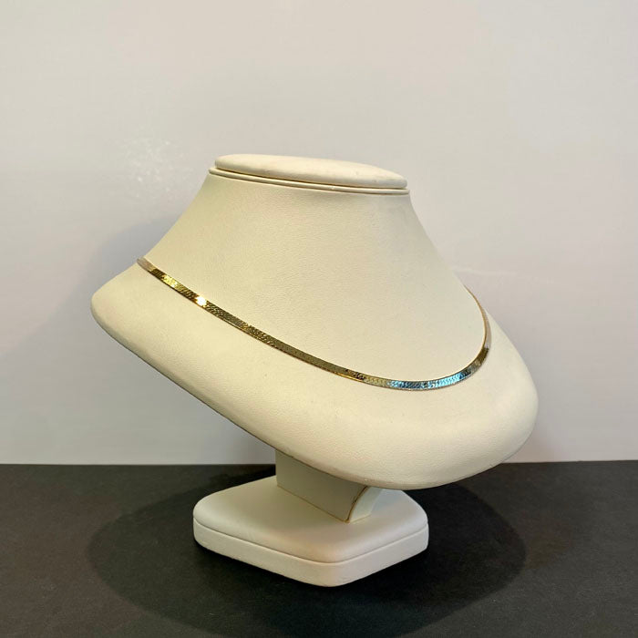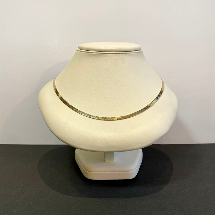 Estate Piece (Previously Owned and Refurbished) One 14K yellow gold herringbone chain necklace.  This necklace was made in Italy. The wearable length of the necklace is 18 inches. There is a lobster clasp. The total weight of this necklace is 9.05 grams.