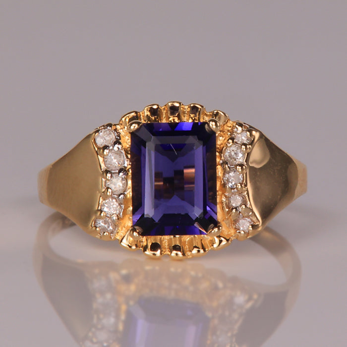 Estate Piece (Previously Owned and Refurbished) One 14k yellow gold iolite diamond accent ring. The iolite is emerald cut, deep blue violet color and has a total approximate weight of 1.30cts. There are round cut diamond accents with a total approximate weight of .10cts. The ring weighs 3.0 grams. Current ring size is 7 1/4. Ring can be sized up/down two sizes from current.