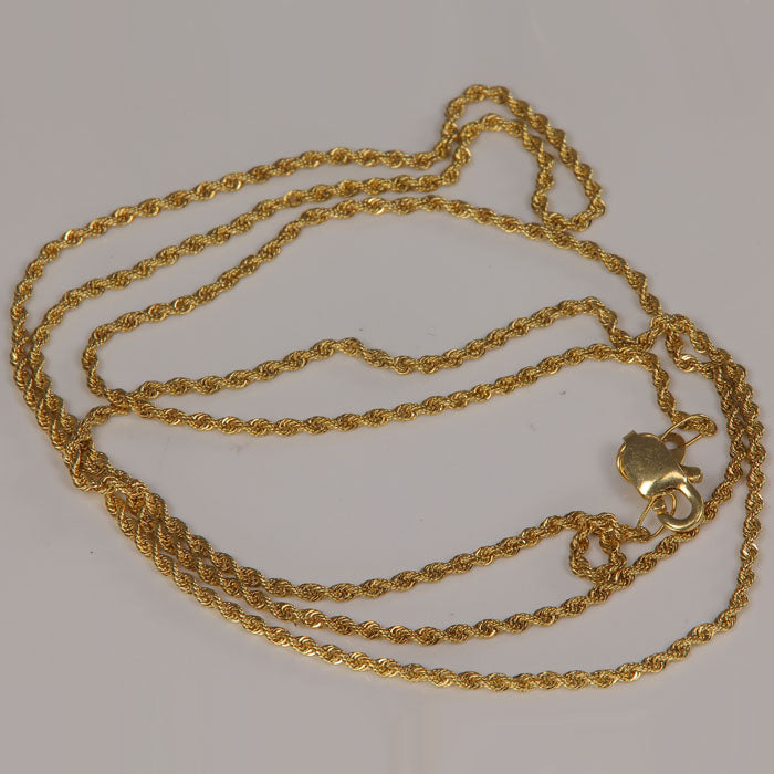 Estate Piece  (Previously Owned and Refurbished) One 14k yellow gold small rope link chain. The wearable length of the chain is 20 inches. There is a lobster clasp. The total weight of this necklace is 3.1 grams.
