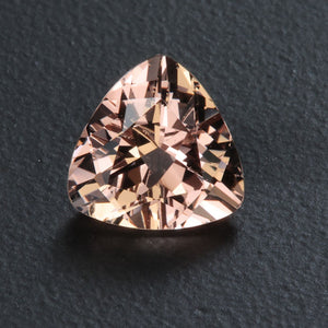 One 2.50 carats trilliant cut Morganite from Madagascar, peach color, VS2 clarity, cut grade very good, measuring 9.3 mm wide, 9.4 mm long, 5.8 mm deep; with very good polish and very good symmetry. Morganite is enhanced by heating.