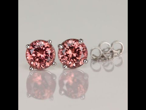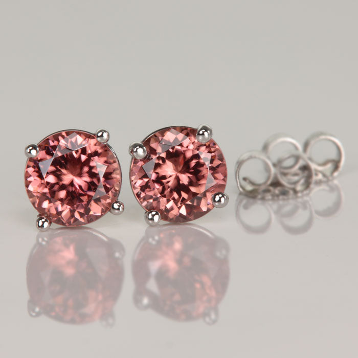 Pair of ladies' 14k white gold imperial zircon stud pierced earrings with friction backs, with two peach color, VS1 clarity, round brilliant cut imperial zircons from Tanzania. The imperial zircons have a total weight of 2.93 carats, measure 6.4 mm wide by 6.4 mm long, and are 4 prong set. Zircons are heated to enhance color.