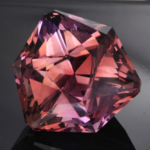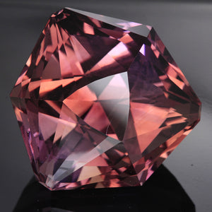 One 322.60 carats Tri-Polar Trilliant ametrine from Bolivia, mixed golden/purple color, SI1 clarity, cut grade excellent, measuring 44 mm wide, 44 mm long, 36 mm deep; with excellent polish and excellent symmetry. The proportions of the ametrine are as follows: total depth 81.8%, table width 34%. Natural color. Cut by Steve Moriarty.