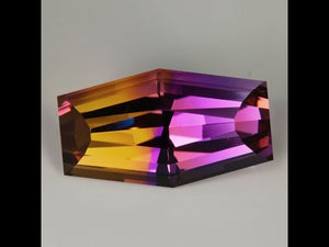 One 36.90 carats hexagon cut ametrine from Bolivia, purple/golden color, VS1 clarity, cut grade excellent, measuring 15.5 mm wide, 28 mm long, 13.4 mm deep; with excellent polish and excellent symmetry. Cut by Steve Moriarty. Natural untreated color.