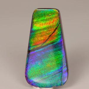 One 19.55 carats freeform cabochon ammolite from the Bearpaw Formation in Alberta Canada, green-blue-red-yellow color, AA clarity, cut grade very good, measuring 14.9 mm wide, 27.5 mm long, 4 mm deep; with very good polish and very good symmetry.A 70 million year old fossil.