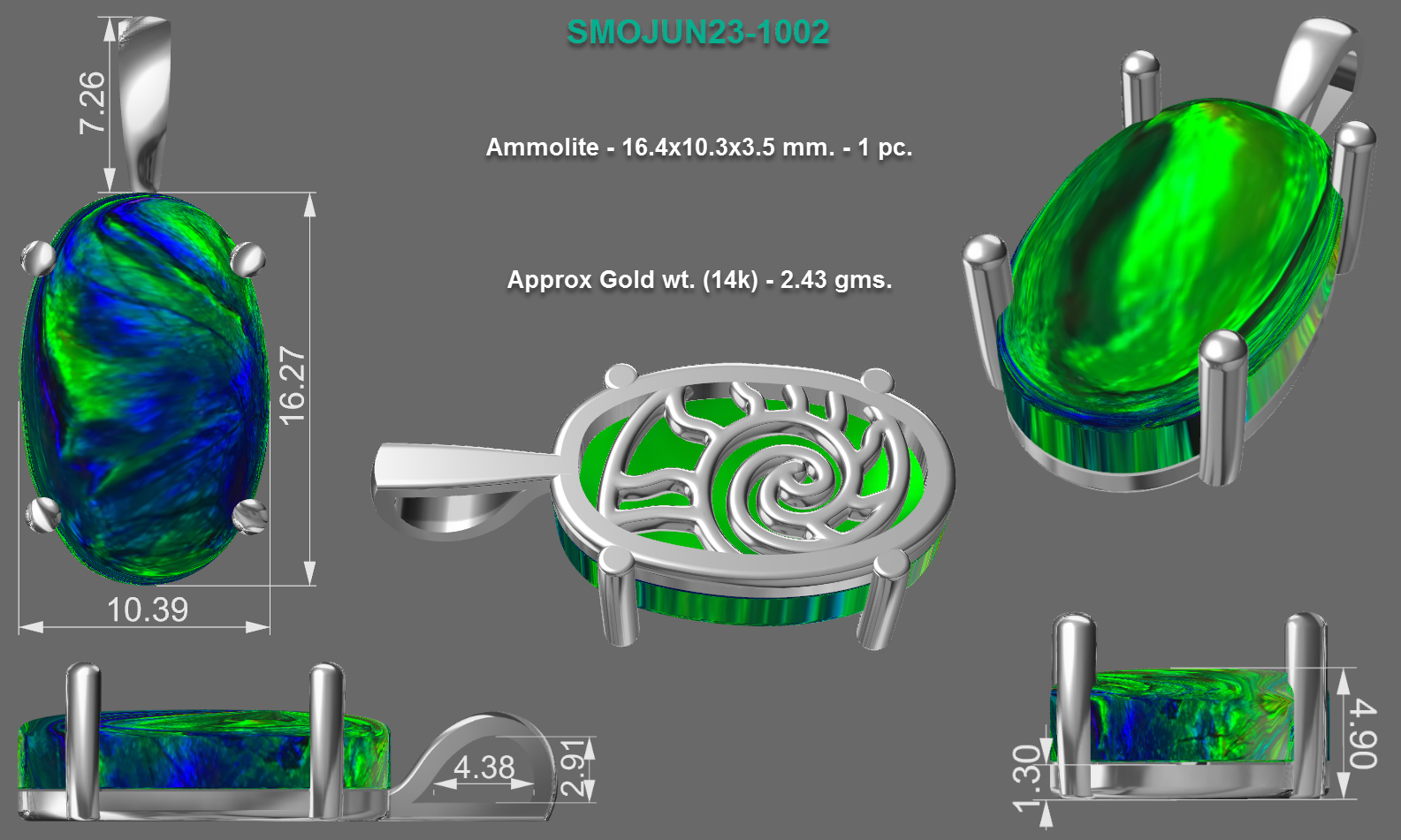14k white gold pendant with ammolite shell on the back, 8.29ct oval ammolite, total price with ammolite is $873 plus tax. This is for a deposit