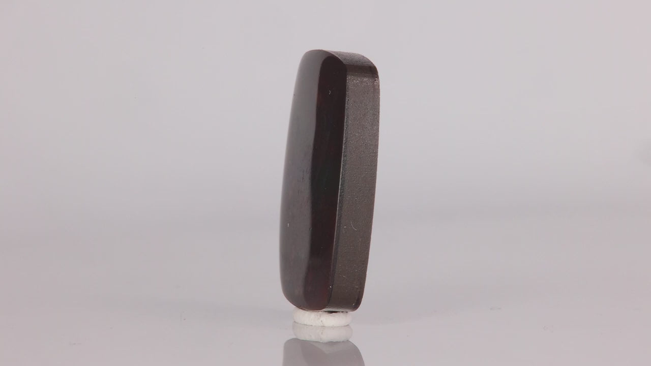 One 21.20 carats antique cushion cabochon ammolite, cut grade very good, measuring 16 mm wide, 23 mm long, 4 mm deep; with very good polish and very good symmetry. . This ammolite is a fossilize ammonite from the Bearpaw formation in Alberta Canada. A fossilized ammonite dates back 70 million years.