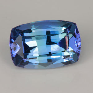 One 2.50 carats antique cushion fancy tanzanite, green/blue color, VS clarity, cut grade good, measuring 6.2 mm wide, 9.2 mm long, 5.2 mm deep; with good polish and good symmetry. Natural untreated color.