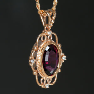 Ladies' 14k rose gold rhodolite garnet pendant by Cghristopher Michael, with one violet red color, GIA Type Il Clarity VS, oval rhodolite garnet. The rhodolite garnet weighs 6.33 carats, measures 8.85 mm wide by 12 mm long by 6 mm deep, and is bezel set. In addition, there are four prong set round brilliant cut diamonds, E-F color, VS clarity, with a total weight of 0.06 carat. The pendant weighs 6.3 grams. Our register #4ga1113.