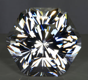 Colorless quartz, 40 hours in the making of this fine hexagonal brilliant gem weighing 571 carats. Steve's largest finished gem. Larger than the largest fine quality diamond the Cullinan 1 at 530.21 carats. This new cutting design, hexamor a play on love and my last name. Great symmetry and exceptional polish. 45 x 45 x 45 millimeters.