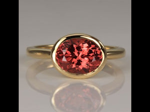 Ladies' 14k yellow gold mahenge garnet ring, with one pink orange color, VS clarity, oval mahenge garnet from Tanzania. The mahenge garnet weighs 3.14 carats, measures 7.5 mm wide by 9.6 mm long, and is bezel set. The ring weighs 5.03 grams. Garnet has natural untreated color.