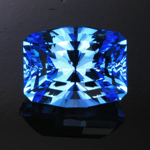 One 21.07 carats antique cushion blue topaz, swiss blue color, VS clarity, cut grade excellent, measuring 13.1 mm wide, 16.8 mm long, 11 mm deep; with excellent polish and excellent symmetry. The proportions of the blue topaz are as follows: total depth 83.9%, table width 41.9%. The overall quality rating of this tanzanite is 942 out of 1000.  Topaz is color enhanced by irradiation. Cut by Steve Moriarty  Jeff Massey