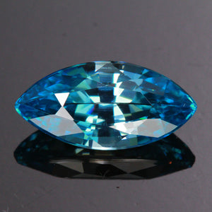One 4.37 carats marquise brilliant cut blue zircon, greenish blue color, cut grade very good, measuring 6.7 mm wide, 13.2 mm long, 5.3 mm deep. From Kampuchea this zircon is heated to enhance color.
