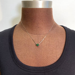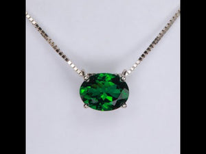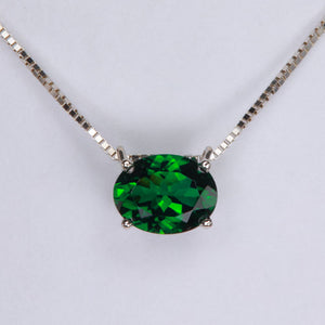 Ladies' 14k white gold box link chrome tourmaline necklace, measuring 18 inches long, with a lobster clasp and one vivid green color, VS1 clarity, oval chrome tourmaline from Tanzania. The chrome tourmaline weighs 1.88 carats, measures 6.5 mm wide by 8.5 mm long, and is 4 prong set. The necklace weighs 2.4 grams.